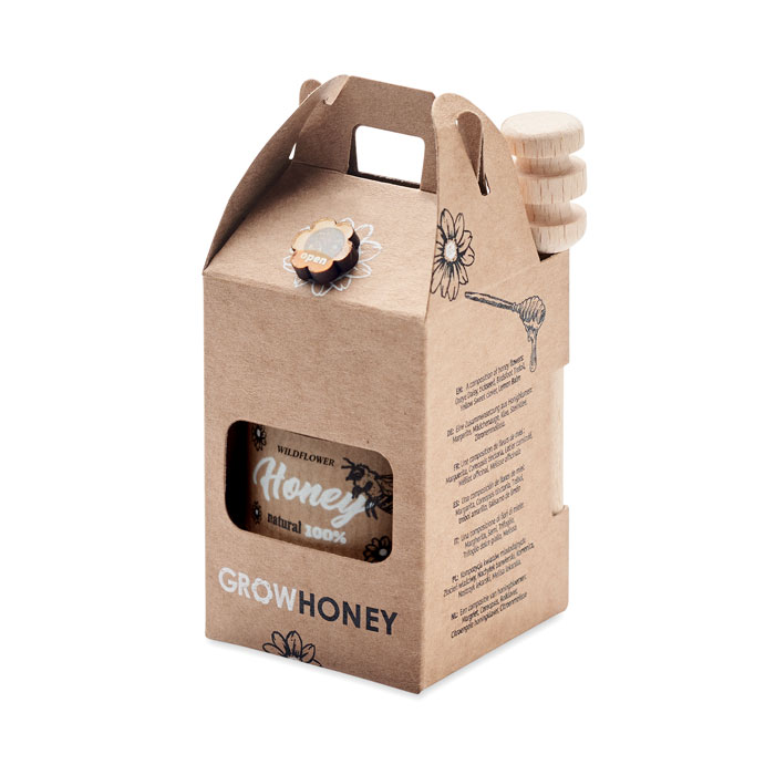 Pot de miel de fleurs sauvages (50g) avec une cuillère à miel en bois. Livré dans une boîte en papier kraft. Avec des graines de fleurs d’abeilles. Fabriqué dans l’UE.