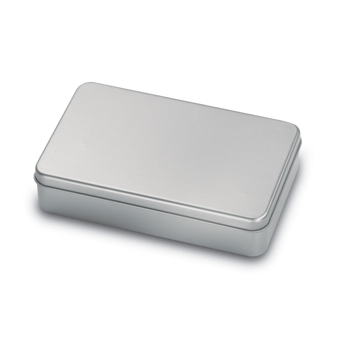 Ensemble d’accessoires 4 pièces comprenant un tire-bouchon, un bouchon, un bec verseur et un anneau anti-gouttes présenté dans une boîte en fer blanc.